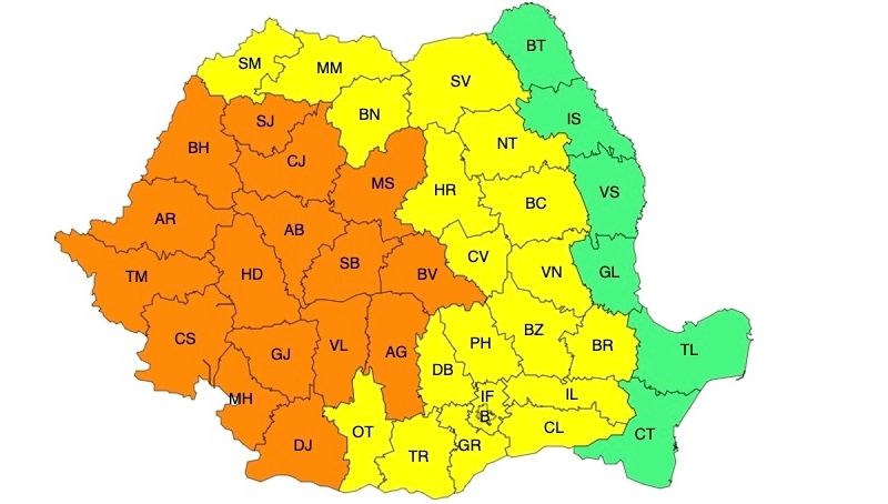Administrația Națională de Meteorologie a emis avertizări cod portocaliu și cod galben de vreme rea, valabile în aproape toată țara.