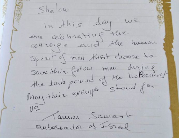 Expoziţia de fotografie, care a prilejuit intalnirea, prezintă o serie de personalităţi care au primit distincţia „Drept între popoare”, titlu acordat de statul Israel, prin Institutul Yad Vashem, în semn de apreciere a contribuţiilor extraordinare aduse la salvarea vieţii evreilor şi la susţinerea valorilor democratice în timpuri de criză.