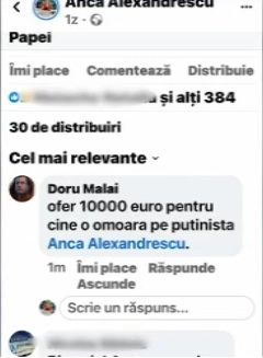 „Mesajul este vizibil pe pagina mea de socializare, poate fi vazut de oricine. Da, a pus 10.000 euro pe capul meu pentru cine doreste sa o omoare pe putinista Anca Alexandrescu va primi 10.000 euro de la un domn care isi spune dl. Doru Malai sau asa ceva. Evident ca este un cont fals. Astept sa revin acasa. Voi face plangere si la politie si la dl. Anton Rog sau cum il cheama de la SRI, sa cerceteze, sa vada cine se ocupa cu asa ceva, pentru ca deja este amenintare directa”, a spus Anca Alexandrescu.