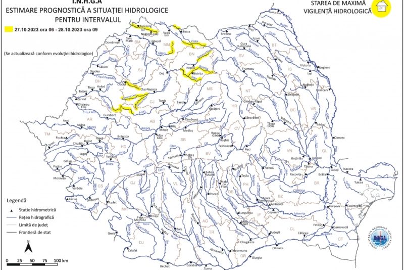 Conform prognozei de specialitate, în perioada 27 octombrie, ora 6:00 - 28 octombrie, ora 9:00, se pot produce scurgeri importante pe versanţi, torenţi şi pâraie, viituri rapide, creşteri de debite şi de niveluri, cu posibile depăşiri ale Cotelor de atenţie, pe râurile din bazinele hidrografice: Tisa - pe sectorul aferent S.H. Valea Vişeului (la intrarea în ţară), Vişeu - bazin superior şi afluenţi bazin mijlociu şi inferior, Iza - bazin superior şi afluenţi bazin mijlociu şi inferior, Lăpuş - bazin superior şi afluenţi bazin mijlociu şi inferior (judeţul Maramureş), Tur (judeţul Satu Mare), Someşul Mare - bazin superior şi afluenţi bazin mijlociu şi inferior (judeţul Bistriţa-Năsăud), Someşul Mic - bazin amonte Ac. Gilău (judeţele: Bihor şi Cluj), Crişul Repede - bazin amonte S.H. Ciucea (judeţele: Cluj şi Bihor), Crişul Negru - bazin amonte S.H. Şuşti şi afluenţii aferenţi sectorului aval S.H. Şuşti - amonte S.H. Beiuş (judeţul Bihor) şi Arieş - bazin amonte S.H. Câmpeni (judeţul Alba).