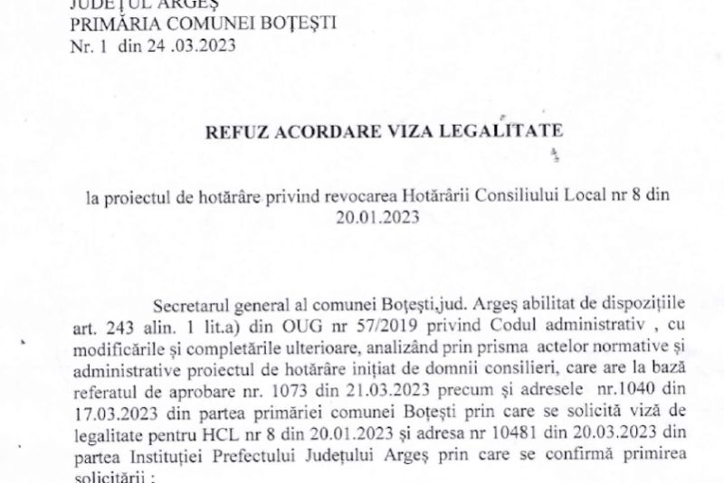 "Prin prezenta vă comunicăm faptul că în urma decizie consiliului local din 28 martie s-a procedat la revocarea HCL nr..... si HCL nr...(...) În urma consultării publice din 25 martie am ajuns la concluzia că locuitorii din Boțești nu doresc nicio intervenție asupra subsolului din raza comunei" a fost răspunsul transmis, marți, 28 martie, de către C.L. Boțești.