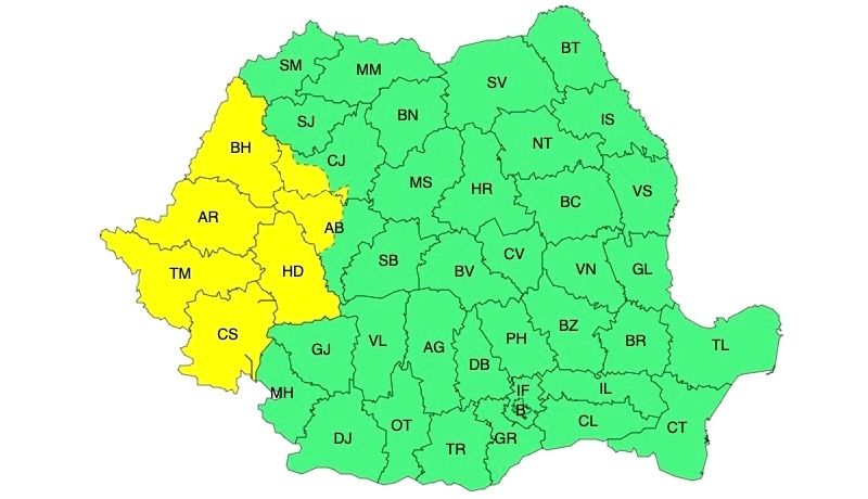 În Banat, Crișana și în vestul Transilvaniei instabilitatea atmosferică va fi accentuată și se va manifesta prin averse, descărcări electrice, intensificări de scurtă durată ale vântului și izolat grindină. În intervale scurte de timp sau prin acumulare cantitățile de apă vor fi de 20...30 l/mp și izolat de peste 40 l/mp.