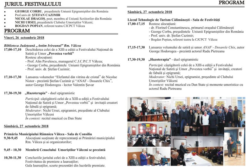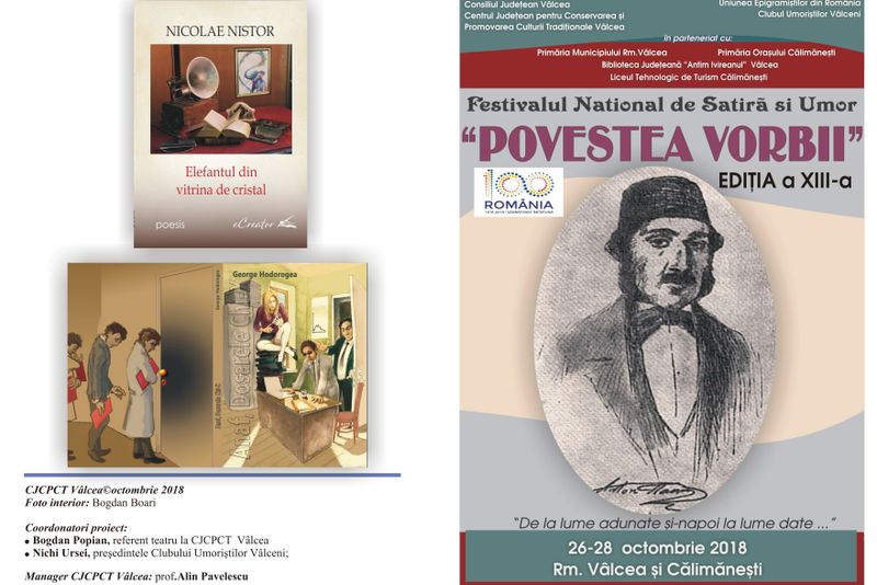 Deschiderea oficială a Festivalului național de satiră și umor va avea loc vineri, 26 octombrie 2018, la Biblioteca Județeană "Antim Ivireanul" din Rm. Vâlcea și va fi urmată de lansarea volumelor "Elefantul din vitrina de cristal", scris de Nicolae Nistor și "ANAF - Dosarele Chix", autor George Hodorogea.