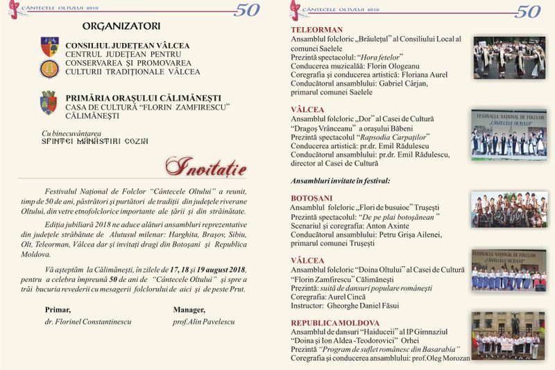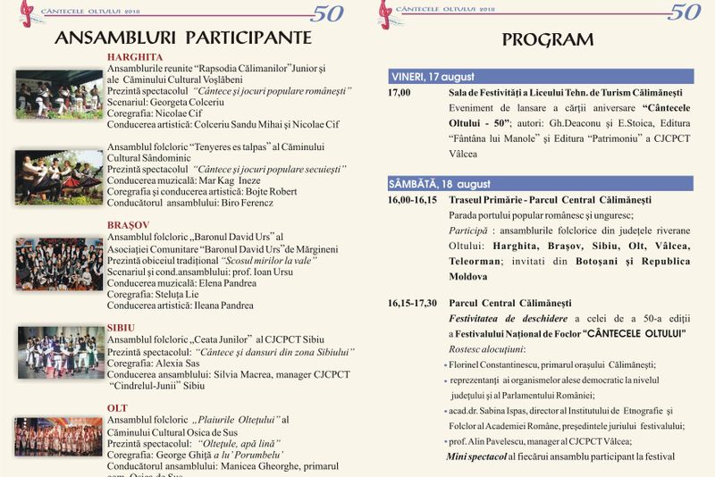 Ediția jubiliară "Cântecele Oltului" va aduce in concurs ansambluri din Harghita, Brașov, Sibiu, Olt, Teleorman, Vâlcea, dar și invitați din Botoșani și Republica Moldova.Programul manifestarilor va debuta vineri, 17 august 2018, când la ora 17,00, are loc lansarea cărţii aniversare “Cântecele Oltului - 50”, în sala de festivităţi a Liceului Tehnologic de Turism Călimăneşti.