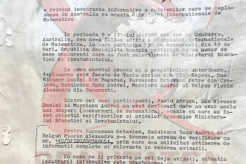 Un document BOMBĂ intrat în posesia Realitatea PLUS aduce acuzații grave la adresa primarului Capitalei, Nicușor Dan. Conform acestui document, Nicușor Dan ar fi colaborat cu Securitatea înainte de olimpiada internațională de matematică din 1988, desfășurată în Australia.
