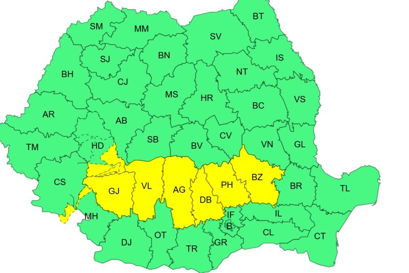 Administrația Națională de Meteorologie (ANM) a emis o atenționare Cod galben de ploi care vizează, în următoarele 24 de ore, județele Gorj, Vâlcea, Argeș, Dâmbovița, Prahova, Buzău, sudul județului Hunedoara, precum și zona de munte a județului Mehedinți.