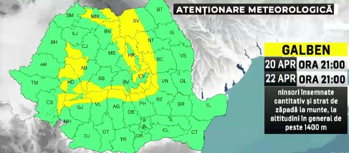 Ninsorile vor fi local, însemnate cantitativ, stratul nou de zăpadă putând atinge grosimi 10-15 centimetri, iar în Carpații Meridionali chiar 20-25 de centimetri. Iar din punct de vedere al regimului de temperatură, e o vreme mai rece decât în mod obișnuit, începând de astăzi și pe parcursul următoarelor zile, în întreaga țară vorbim de temperaturi cu 5 până la 10 grade sub ceea ce ar fi normal pentru ultima decadă a unei luni aprilie în țara noastră.