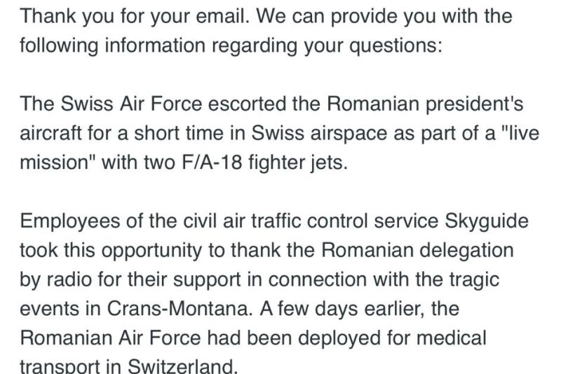 În răspunsul transmis postului Realitatea Plus de purtătorul de cuvânt al Armatei Elvețiene se precizează clar că „angajații serviciului civil de control al traficului aerian Skyguide au profitat de această ocazie pentru a mulțumi delegației române, prin radio, pentru sprijinul acordat în legătură cu evenimentele tragice din Crans-Montana”.