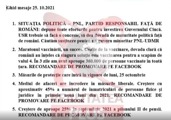 Potrivit Ghidului de mesaje din PNL de luni, 25 octombrie 2021, prezentat de Anca Alexandrescu, printre principalele promovări se află situația politică - „PNL, responsabilitate față de români”, urmat de „Maratonul vaccinării - un succes”, recomandat să fie promovat intens pe rețelele de socializare, sau de încrederea mediului de afaceri în măsurile liberale, de creșterea pilonului II de pensii, cu 25%.