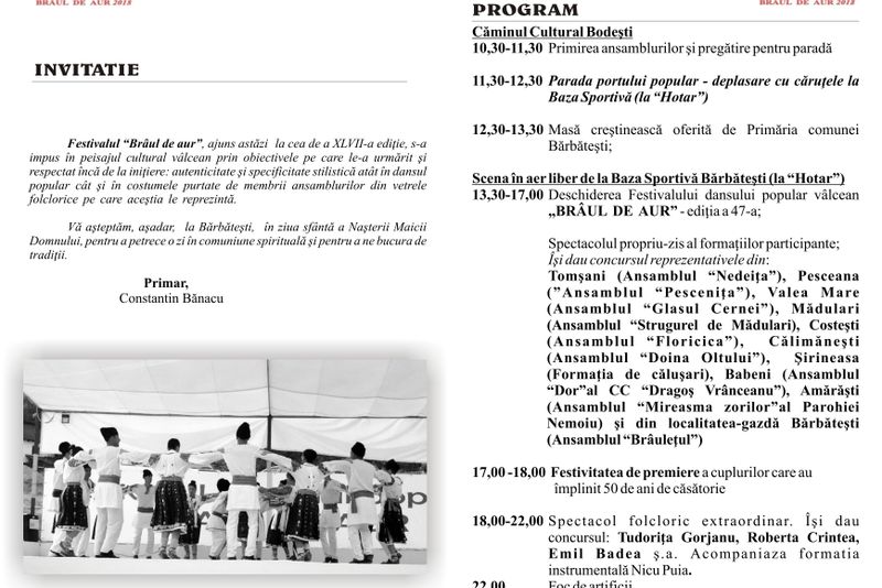 Primăria Bărbăteşti, în colaborare cu Centrul pentru Conservarea și Promovarea Culturii Tradiționale Vâlcea, Consiliul Local Bărbătești şi Căminele Culturale Bodești și Bărbătești, lucrează în această perioadă la ultimele detalii organizatorice pentru că evenimentul, "Brâul de Aur" să fie unul de succes, aşa cum au fost obişnuiţi invitaţii, de fiecare dată.Încă de la ediția trecută, festivalul și-a mutat locația de pe Valea Otăsăului, la baza sportivă din localitate, idee primită foarte bine de localnici, care au fost prezenți în număr mult mai mare.Având în vedere faptul că formaţiile și ansamblurile invitate vor îndemna oamenii să iasă la joc, la baza sportivă este loc suficient pentru că oamenii să se simtă bine.
