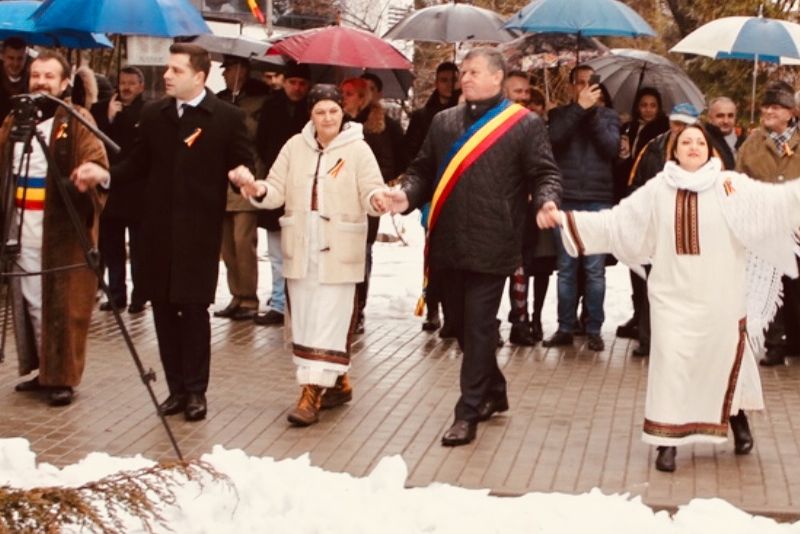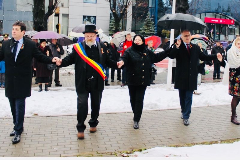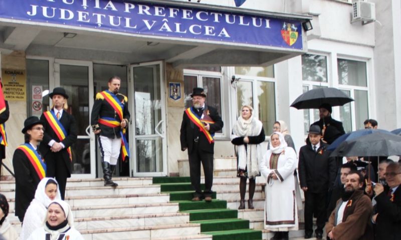 Hora Unirii în ploaie în această dimineață pe platoul din fața prefecturii Vâlcea, discursuri, sunet de clopote și o prezență unică: domnitorul Alexandru Ioan Cuza.