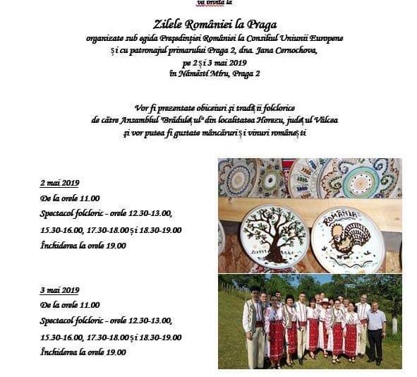 "Zilele României la Praga" sunt organizate sub egida Președinției României la Consiliul Uniunii Europene și sub patronajul primarului Praga 2, Jana Cernochova.Festivalul va avea loc în perioada 2, 3 mai, în Námestí Míru.