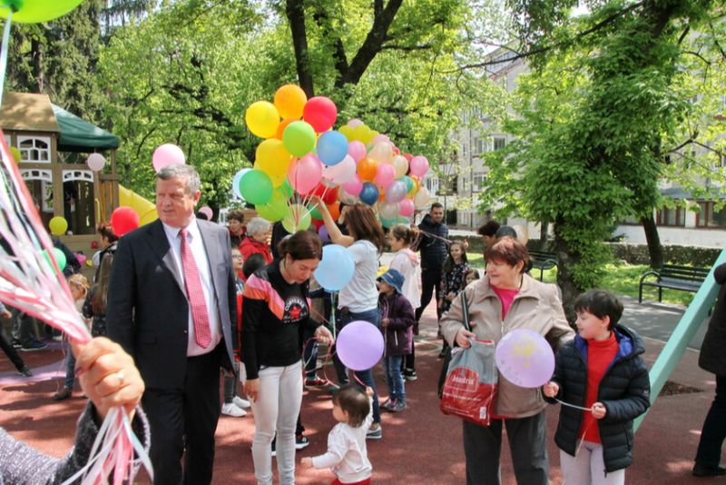 Bunici și copii prezenti astăzi, alături de autoritățile locale, la inaugurare locului de joacă modernizat din Parcul Mircea cel Bătrân din Râmnicu Vâlcea.