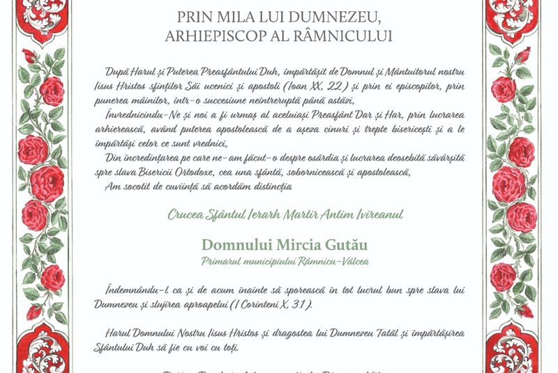 Totodată, edilul Râmnicului a rememorat cu emoţie momentul alegerii Sfântului Antim Ivireanul ca patron spiritual al oraşului la care a fost martor, în 1999, din postura de consilier municipal.Cu aceeaşi ocazie, viceprimarul Eusebiu Veţeleanu a anunţat că Primăria Râmnicului a început demersurile şi contactele necesare pentru înfrăţirea municipiului cu localitatea Ude din Georgia – locul de naştere al lui Antim Ivireanul.În acelaşi context festiv, miercuri, 25 septembrie, în cadrul evenimentului cultural organizat de Arhiepiscopia Râmnicului la Filarmonica ”Ion Dumitrescu”, primarul Mircia Gutău a primit din partea Arhiepiscopului Râmnicului, ÎPS Varsanufie, distincţia ”Crucea Sfântului Ierarh Martir Antim Ivireanul”.