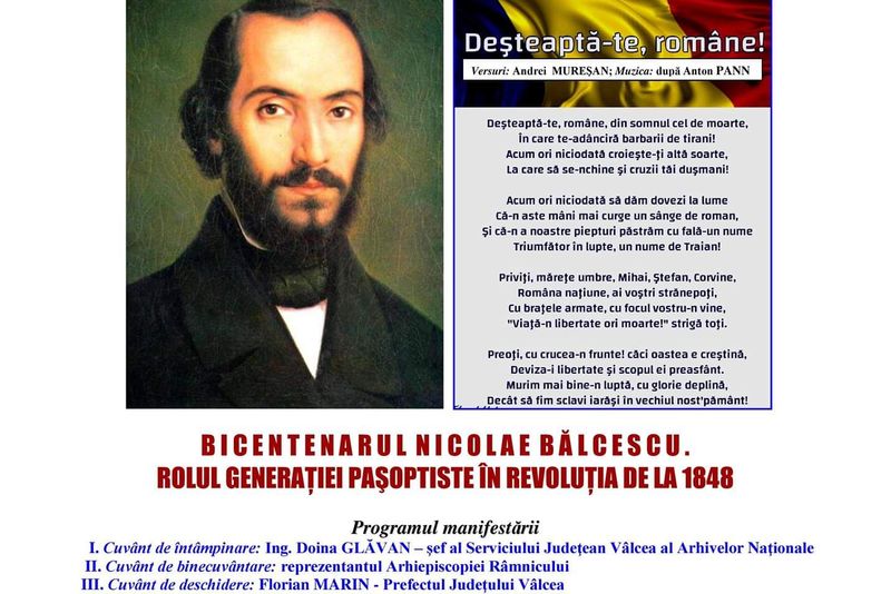 Evenimentul este organizat de Serviciul Județean Vâlcea al Arhivelor Naționale și Forumul Cultural al Râmnicului, cu prilejul sărbătoririi Zilei Imnului Național.Program:I. Cuvânt de întâmpinare: Ing. Doina Glăvan – şef al Serviciului Judeţean Vâlcea al Arhivelor Naţionale II. Cuvânt de binecuvântare: reprezentantul Arhiepiscopiei Râmnicului III. Cuvânt de deschidere: Florian Marin – Prefectul judeţului Vâlcea IV.Argumentum: Prof. Dr. Ion Soare – preşedintele Forumului Cultural al Râmnicului V. Comunicări: • Prof. Dr. Gheorghe Dumitrașcu – „Locul şi rolul lui Nicolae Bălcescu în Revoluţia română de la 1848” • Prof. Nelu Barbu – „Vocaţia de întemeietor a lui Nicolae Bălcescu” • Prof. Dr. Ioan St. Lazăr – „Cântarea României”, de la Alecu Russo şi Nicolae Bălcescu, la Vasile Pârvan • Prof. Dr. Florin Epure – „O călătorie a lui Nicolae Bălcescu la mănăstirile vâlcene” • Dr. Dragoș Teodorescu – „Revoluţia exilată”. Generaţia paşoptistă şi Marile Puteri europene (1848-1859) • Dr. Ionela Dinescu – „Generalul Gheorghe Magheru, personalitate a Revoluţiei de la 1848” • Valentin Hănulescu – Memorialul „Nicolae Bălcescu”: Sub steagul românismului