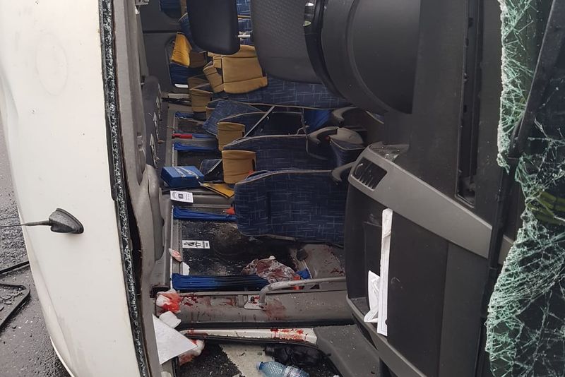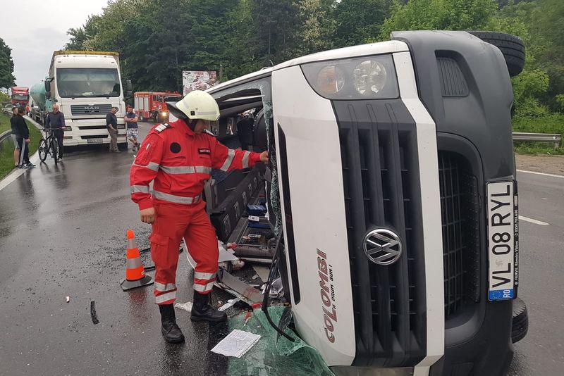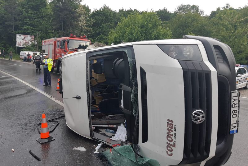 Un microbuz, care circula pe directia Sibiu-Rm Valcea, s-a rasturnat cu cel putin 12 persoane la bord dupa ce a fost acroșat de semiremorca unui tir care venea din sens opus.