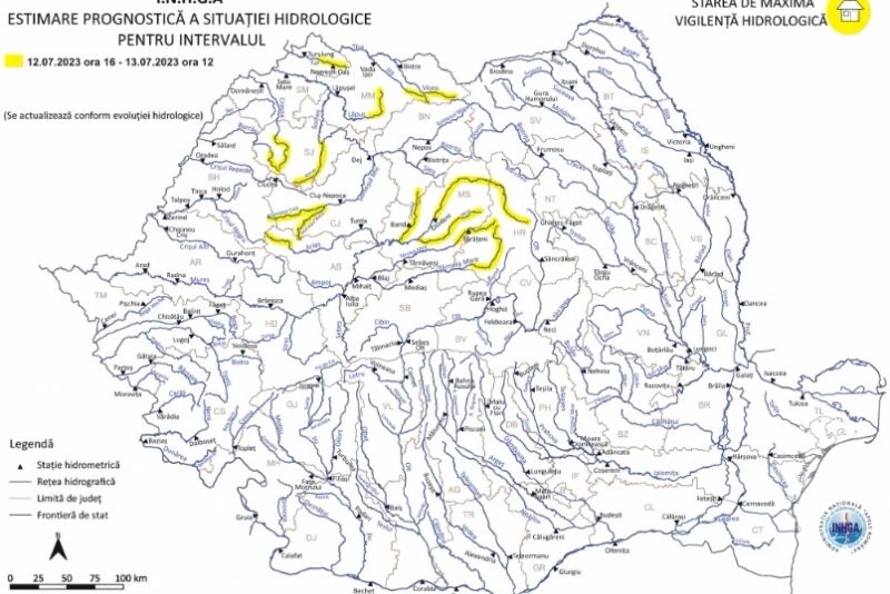 În intervalul 12.07.2023 ora 16:00 – 13.07.2023 ora 12:00 pe râurile din bazinele hidrografice: