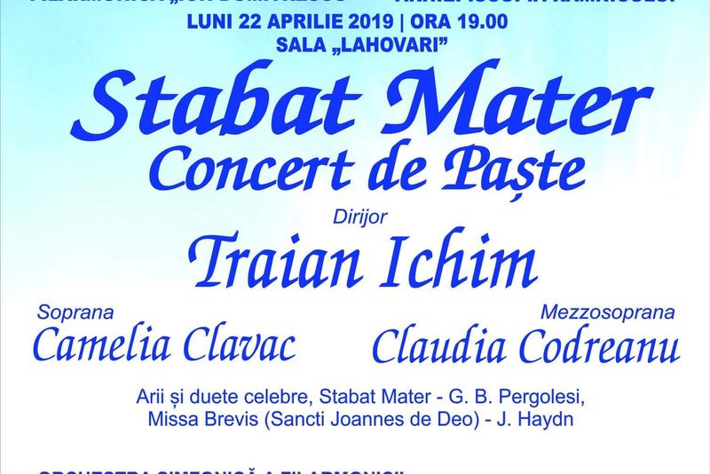 Orchestra simfonică a filarmonicii, Corul Euphonia în colaborare cu membri ai Corului Seminarului Teologic „Sf. Nicolae” din Râmnicu Vâlcea prezintă, cu prilejul Sărbătorilor Pascale, concertul “Stabat Mater".