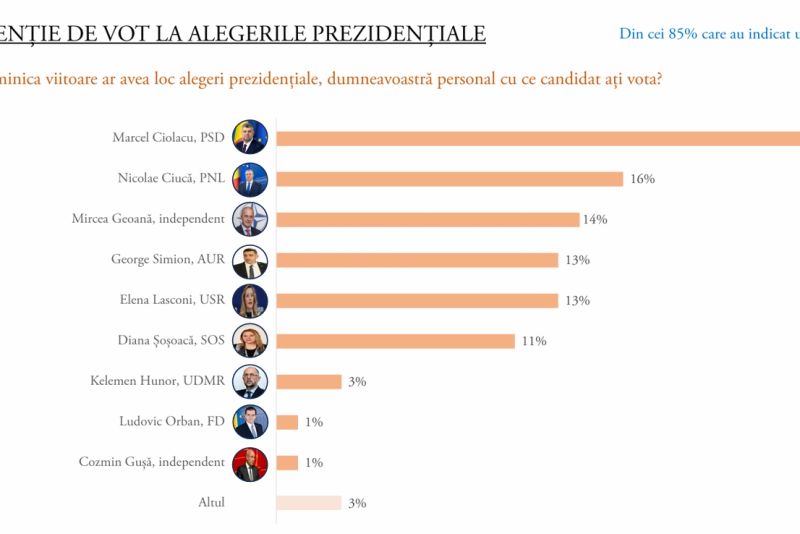 Dacă duminica viitoare ar avea loc alegeri prezidențiale, Ciolacu ar fi votat de 25% dintre alegători, Ciucă de 16%, urmat de independentul Mircea Geaonă, cu 14% dintre voturi. George Simion și Elena Lasconi s-ar afla la egalitate, cu un procent de 13%.