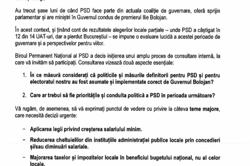 „Așteptăm, în egală măsură, perspectiva dumneavoastră asupra obiectivelor social-democrate esențiale pe care PSD trebuie să le promoveze și să le apere în actuala guvernare, precum și asupra direcției de urmat în situația în care partenerii de coaliție nu vor ține cont de aceste priorități ale electoratului PSD.”, se arată în scrisoare.